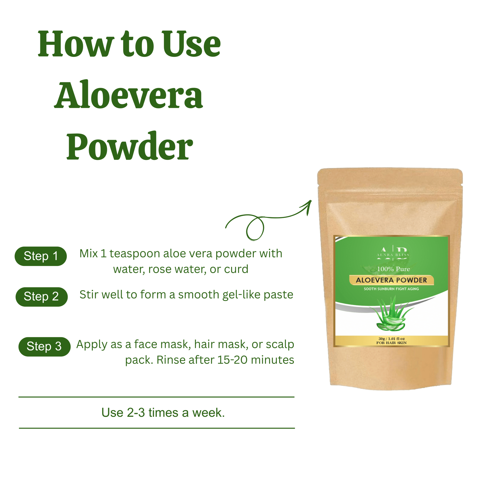 Aenra Bliss Aloe Vera Powder is a natural herbal ingredient commonly used in skincare and hair care routines. It is made by drying aloe vera leaves and grinding them into a fine powder while preserving their natural goodness.